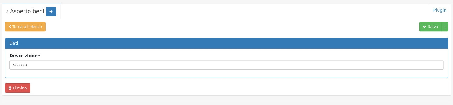 Cliccando sul record da modificare si aprirà la schermata di dettaglio, da cui sarà possibile modificare la descrizione dell'aspetto beni selezionato.