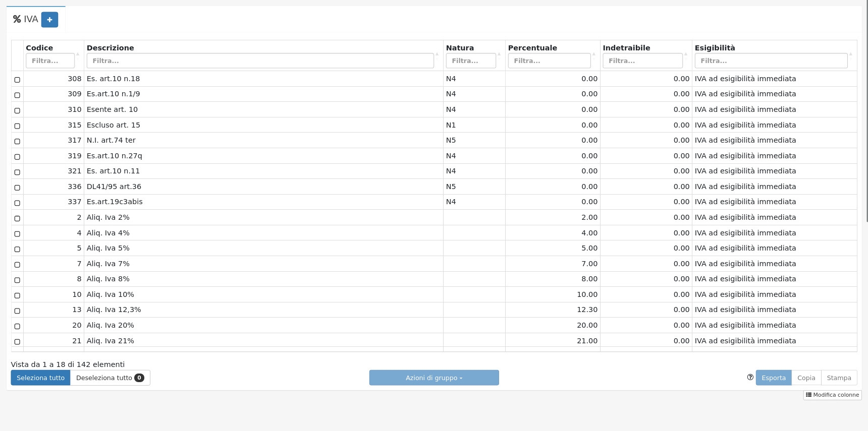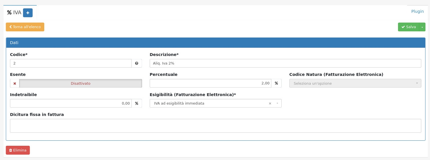 Per creare una nuova aliquota IVA si dovrà cliccare sul tasto (+).