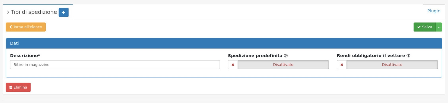 Per creare un nuovo tipo di spedizione si dovrà cliccare sul tasto (+).