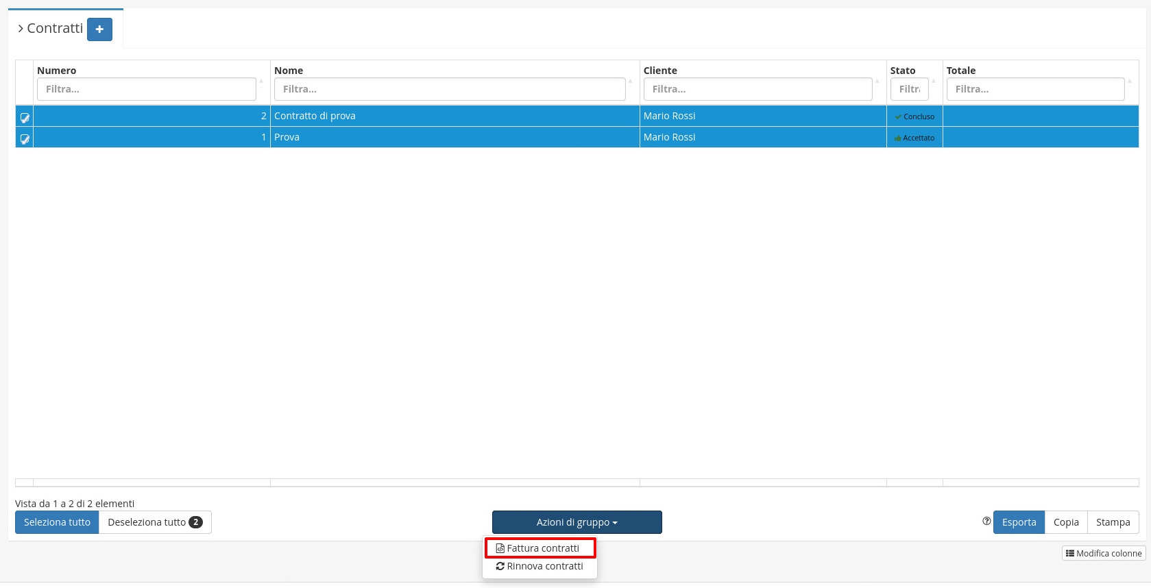 Una volta selezionati i record interessati è possibile fatturare massivamente i contratti cliccando su Azioni di gruppo/Fattura contratti.