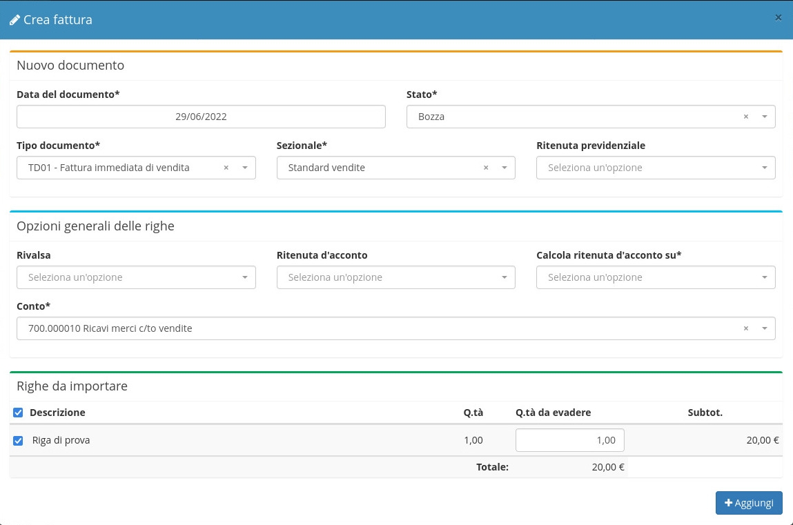 Una volta apportate le necessarie modifiche si dovrà cliccare su Aggiungi per procedere alla creazione della fattura di vendita.