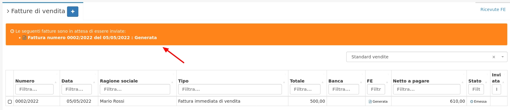 Nel caso siano presenti delle fatture di vendita generate ma non ancora inviate (entro i 12 giorni dalla scadenza per inviare le fatture allo SDI), verranno segnalate dal gestionale con un avviso nella sezione fatture di vendita.
