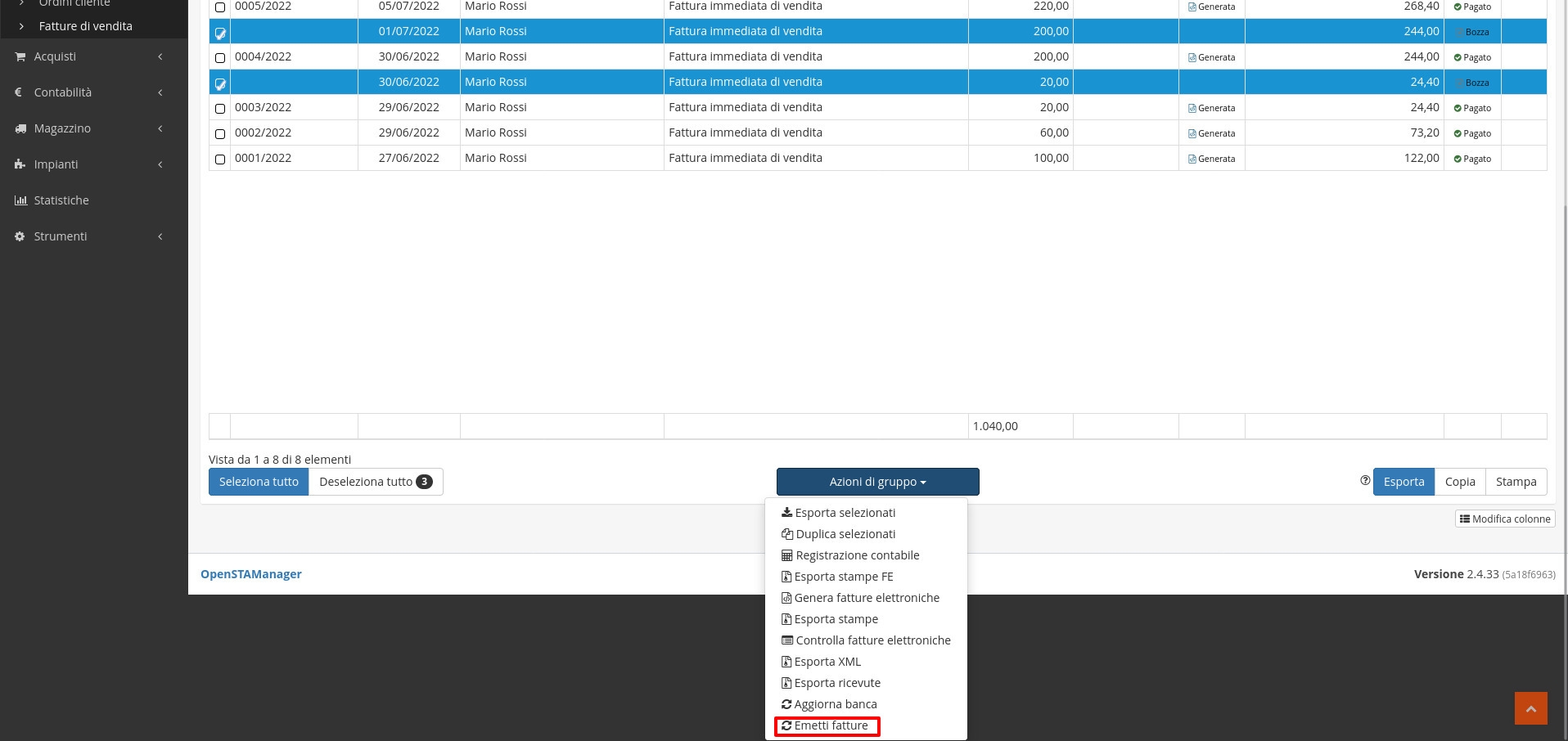 Una volta selezionati i record interessati è possibile procedere all'emissione massiva delle fatture cliccando su Azioni di gruppo/Emetti fatture.