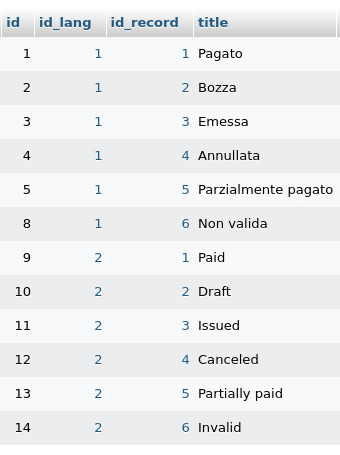 mentre la tabella co\_stati\_document&#x6F;**\_lang** conterrà la traduzione in italiano con id\_lang = 1 e quella in inglese con id\_lang = 2 (come definito in zz\_langs) per ogni id\_record.
