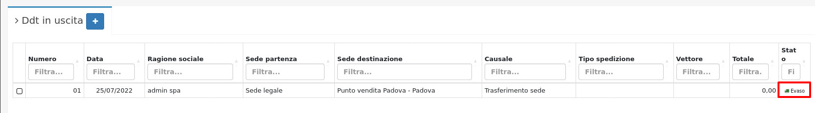 Verrà così generato un DDT in uscita con stato Evaso con gli stessi estremi di quello registrato in entrata.