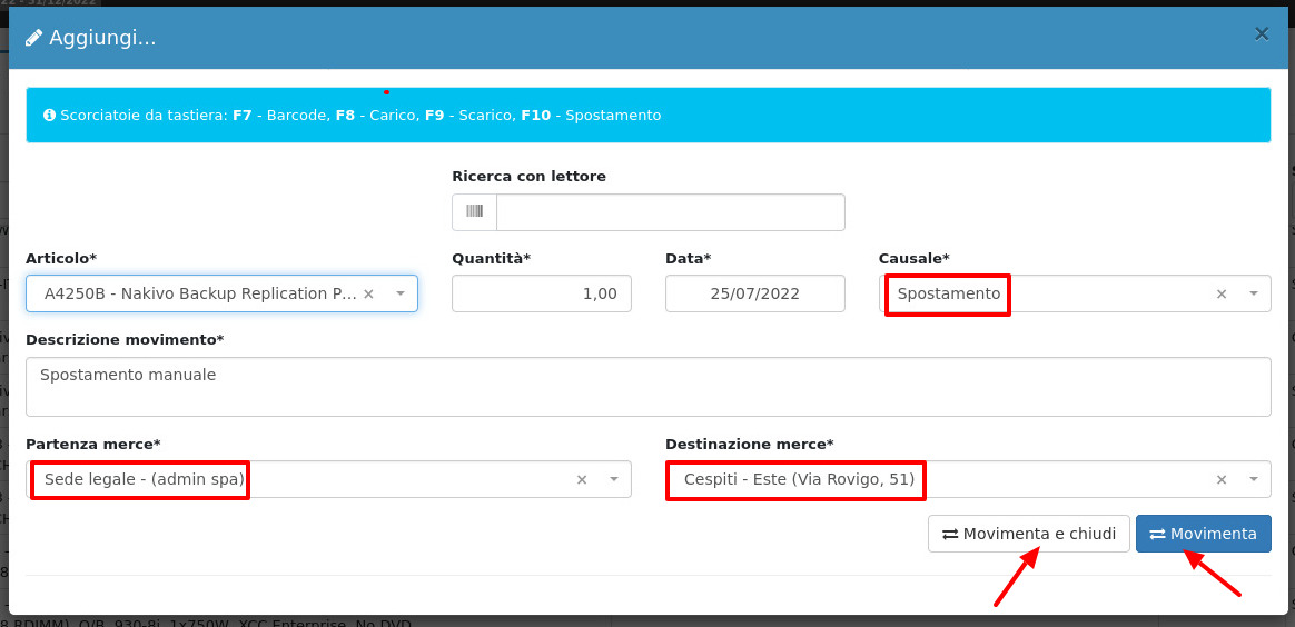 Qui si dovranno andare a selezionare la sede di partenza e di destinazione dell'articolo, selezionando come causale "Spostamento". E poi cliccando su Movimenta per procedere a inserire un altro movimento, o su Movimenta e chiudi per tornare all'elenco dei movimenti.