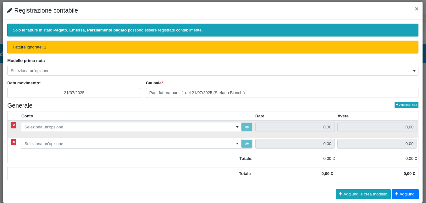 Con questa operazione è possibile registrare un movimento in prima nota relativo alle fatture selezionate