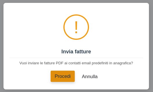 Con questa operazione è possibile inviare i PDF delle fatture selezionate via mail, agli indirizzi email predefiniti delle anagrafiche associate alle fatture selezionate.