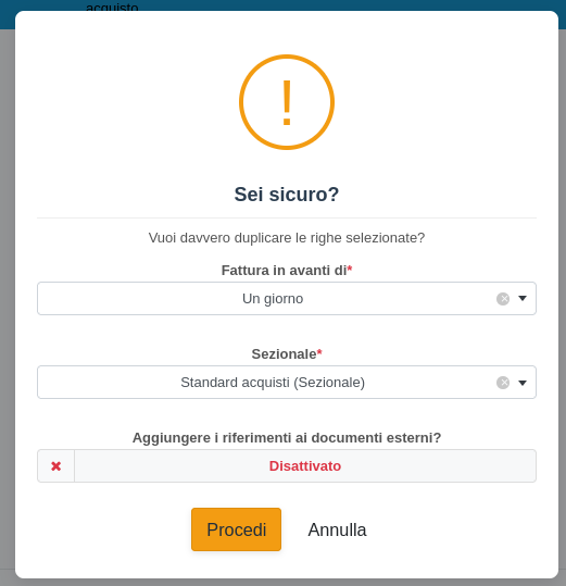 Con questa operazione è possibile creare un duplicato dei documenti selezionati, scegliendone la data, il sezionale e se aggiungere a un documento già presente in bozza o crearne uno ex novo.