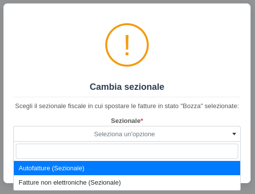 Con questa operazione è possibile spostare le fatture di acquisto in stato bozza tra sezionali dello stesso tipo, quindi tra sezionali fiscali o tra sezionali non fiscali.