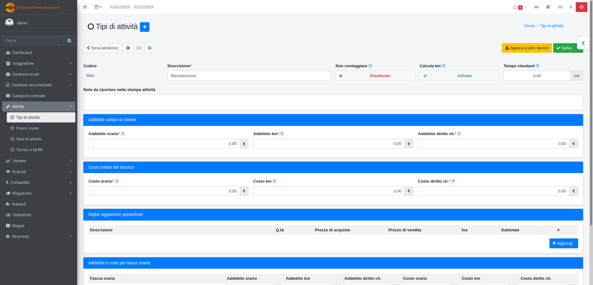 Il modulo Tipi di attività permette di creare una sorta di tariffario da assegnare ad un Tecnico per lo svolgimento di un'attività.