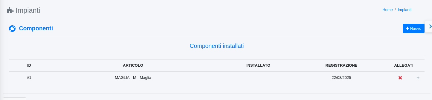 Il plugin Componenti permette di collegare degli articoli di magazzino all'impianto.