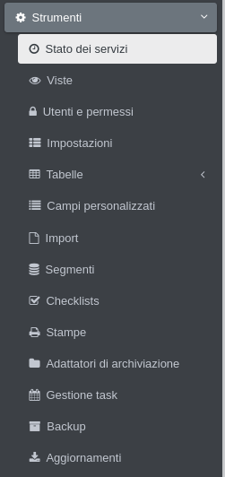 Stato dei serviziVisteUtenti e permessiImpostazioniTabelleCampi personalizzatiImportSegmentiChecklistsStampeAdattatori di archiviazioneGestione taskBackupAggiornamentiWas this helpful?