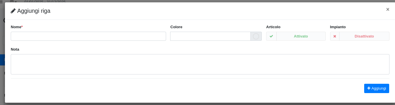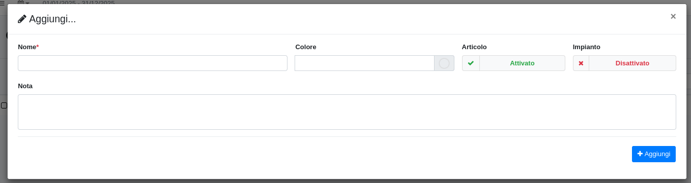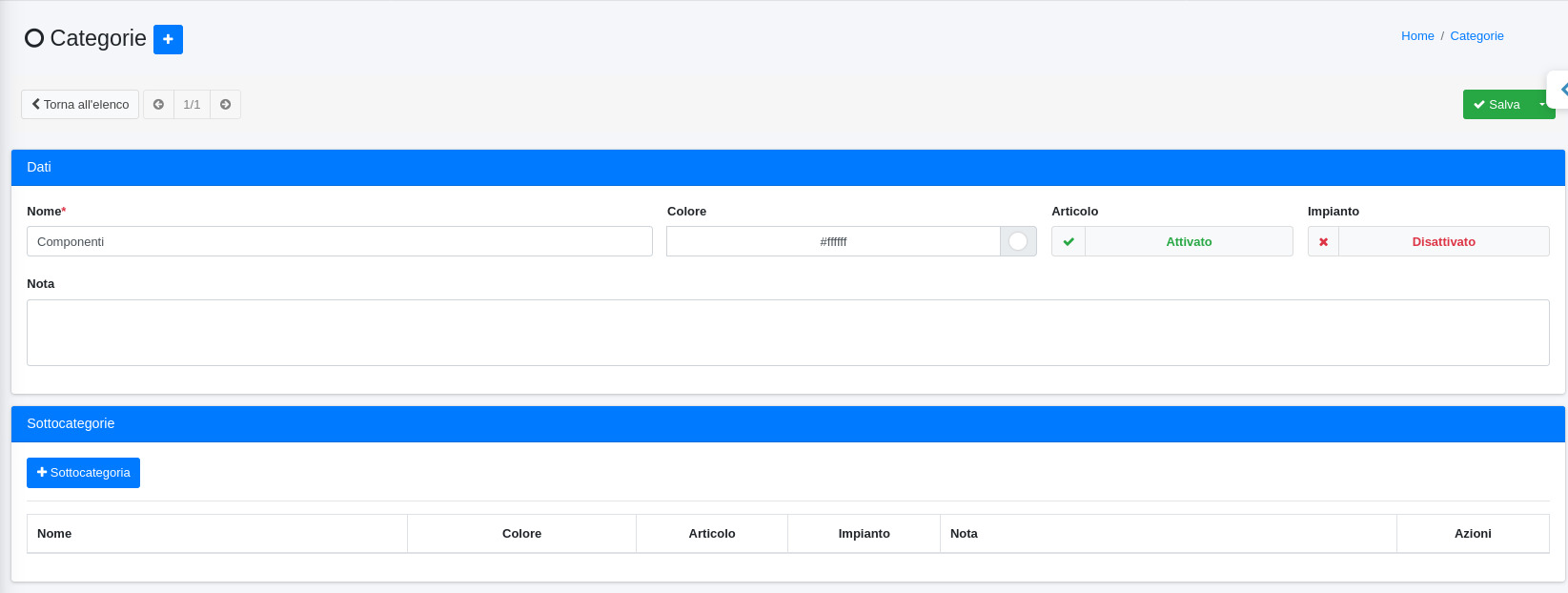 Per aggiungere una nuova sottocategoria si dovrà cliccare su (+ Sottocategoria) e inserire Nome e Colore. Il tipo di sottocategoria è definito in base al tipo di categoria (Articolo e/o impianto)