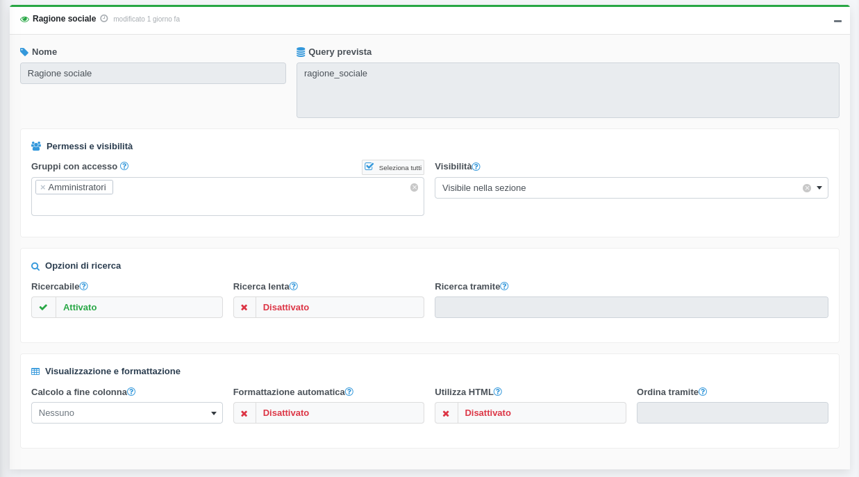 • Gruppi con accesso (gruppi e utenti in grado di visualizzare quel campo)