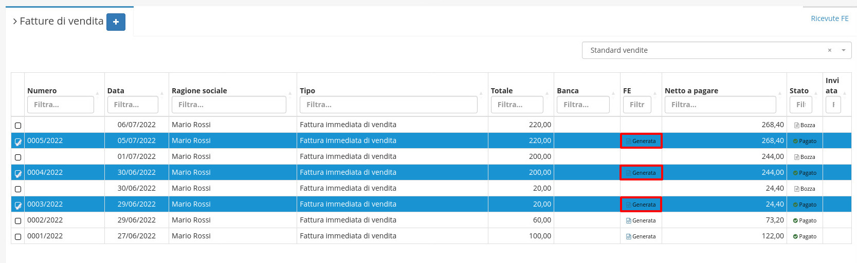 Si potranno ora vedere tra le fatture di vendita i record appena creati.