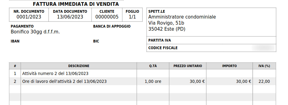 Ad esempio, nel caso di interventi di manutenzione eseguiti in un condominio dove il committente è il condomino ma a saldare la parcella sarà l'amministratore condominiale, si dovrà creare un'attività con il condomino come cliente, e valorizzare il campo 'Per conto di' con i dati dell'amministratore.