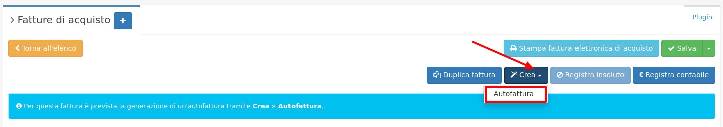 Cliccando sulla fattura appena registrata si accederà alla schermata di dettaglio della stessa, dove sarà possibile notare un avviso che guida alla generazione dell'autofattura per andare a reintegrare l'IVA, si dovrà quindi cliccare su Crea/Autofattura.