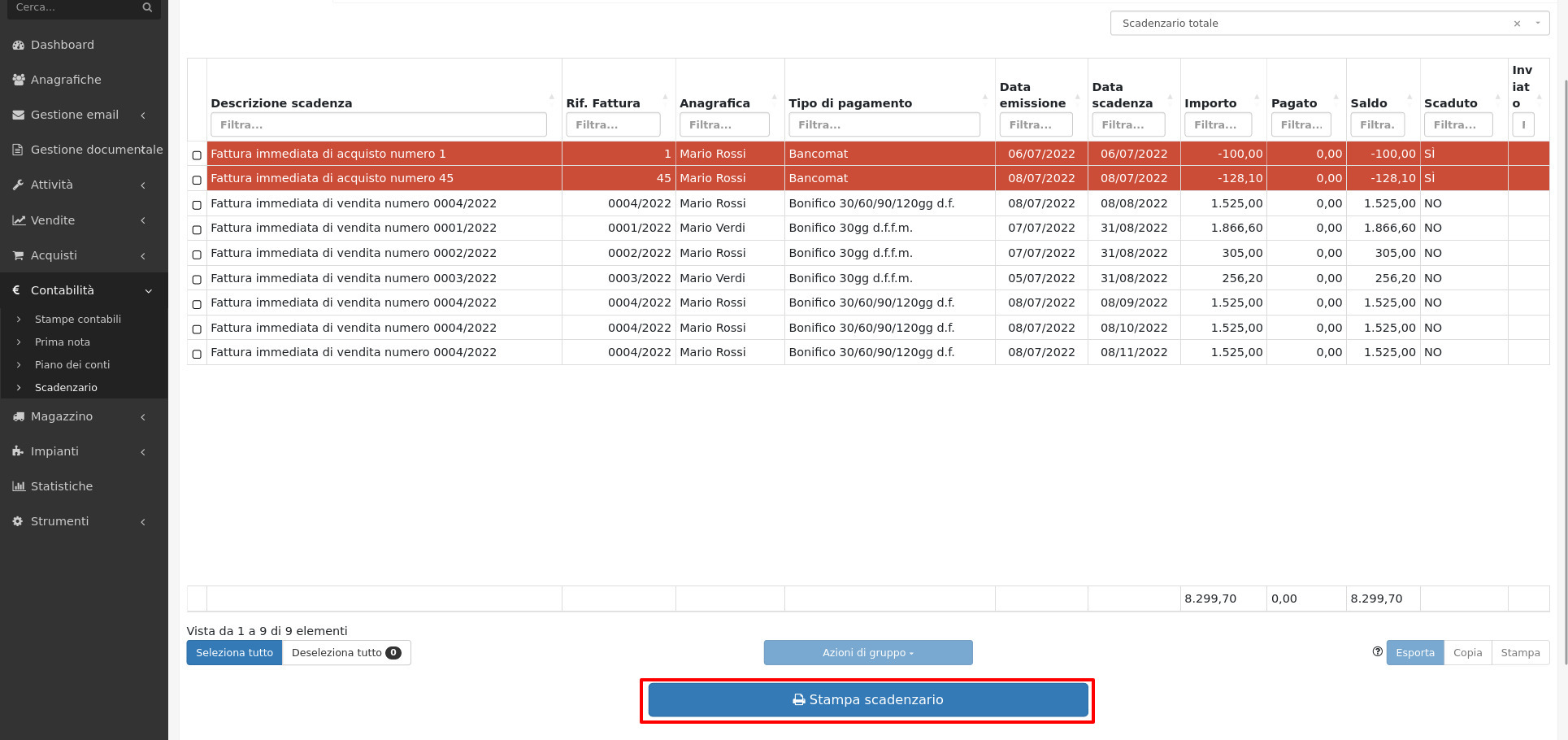 Il gestionale permette la stampa scadenzario dal tasto sotto alla tabella.
