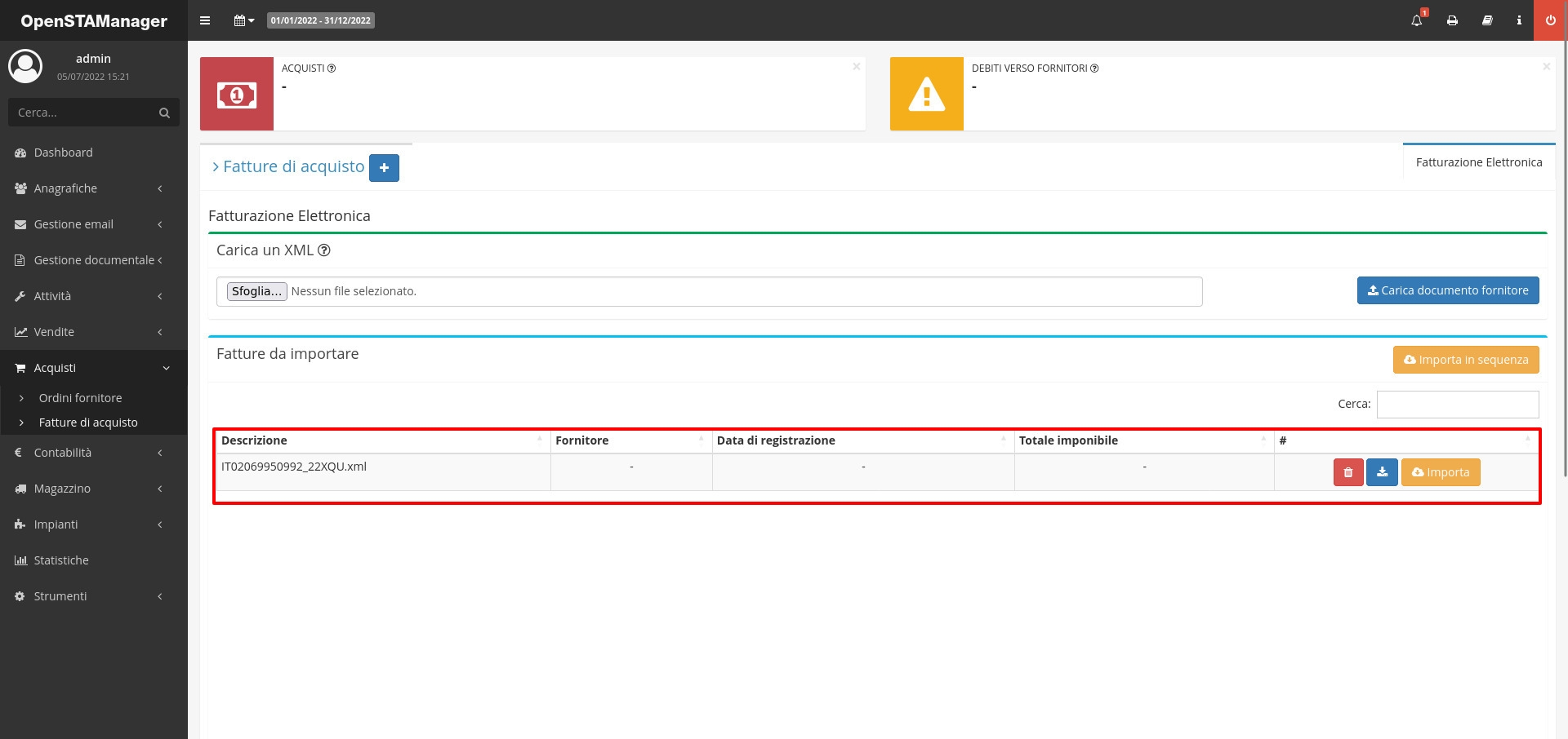 Sarà possibile ora visualizzare una lista delle fatture di acquisto da importare dallo SDI, che sarà possibile importare massivamente cliccando su Importa in sequenza.