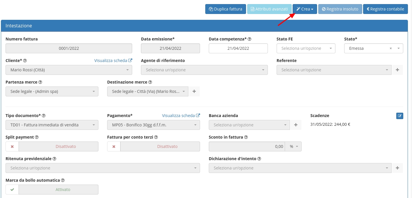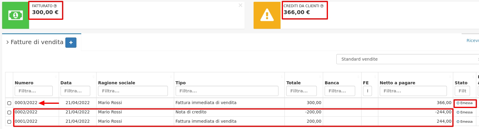 Impostando lo stato su Emessa, alla Nota di credito verrà assegnato un numero fattura progressivo e si potrà andare ora a Creare una fattura di vendita corretta.