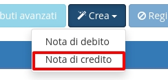 A partire dalla fattura di vendita di cui si vuole emettere nota di credito, cliccando su Crea/Nota di credito.