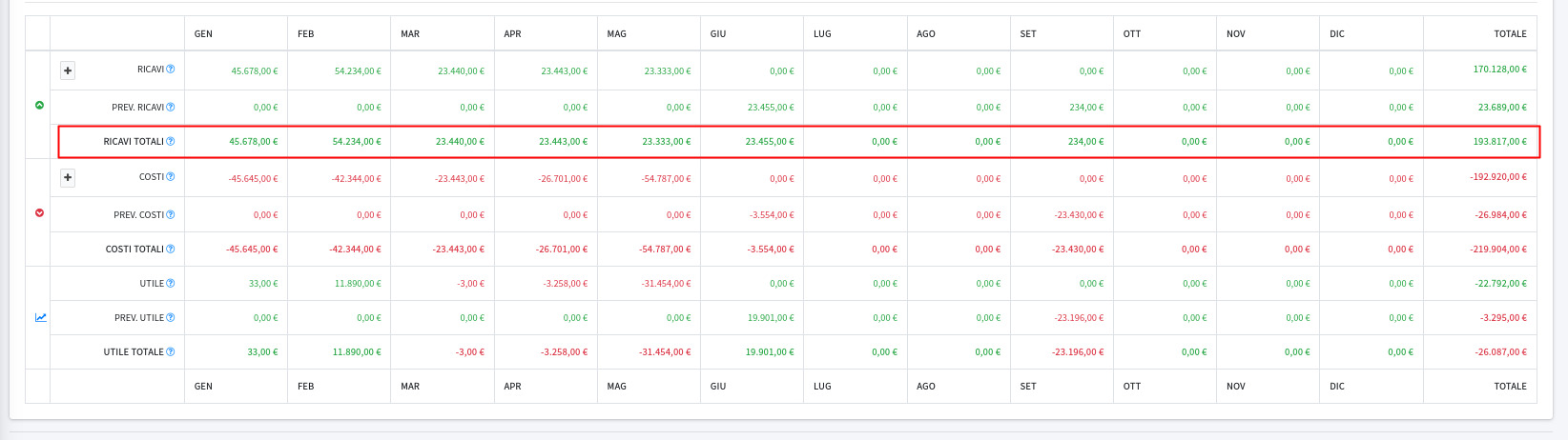 Ponendo l'attenzione sui ricavi si può notare che i ricavi reali sono composti dalla somma delle fatture di vendita già contabilizzate, mentre i ricavi totali sono formati dalla somma di questi e i ricavi previsti da previsionali o sergenti dati esterne.
