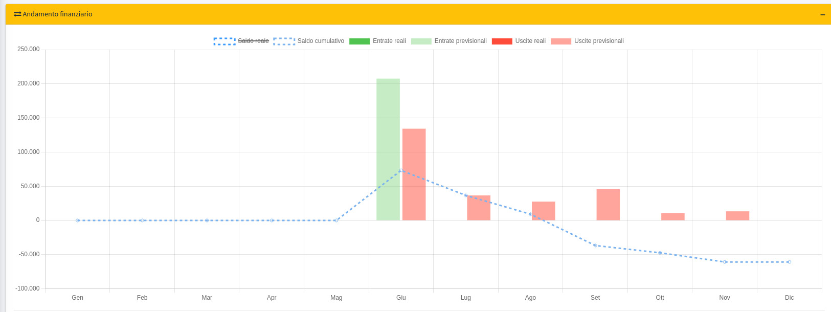 L'andamento finanziario, a differenza di quello economico, attinge dati anche dallo scadenzario, e va quindi ad imputare tutte le scadenze previste nel relativo periodo di competenza.
