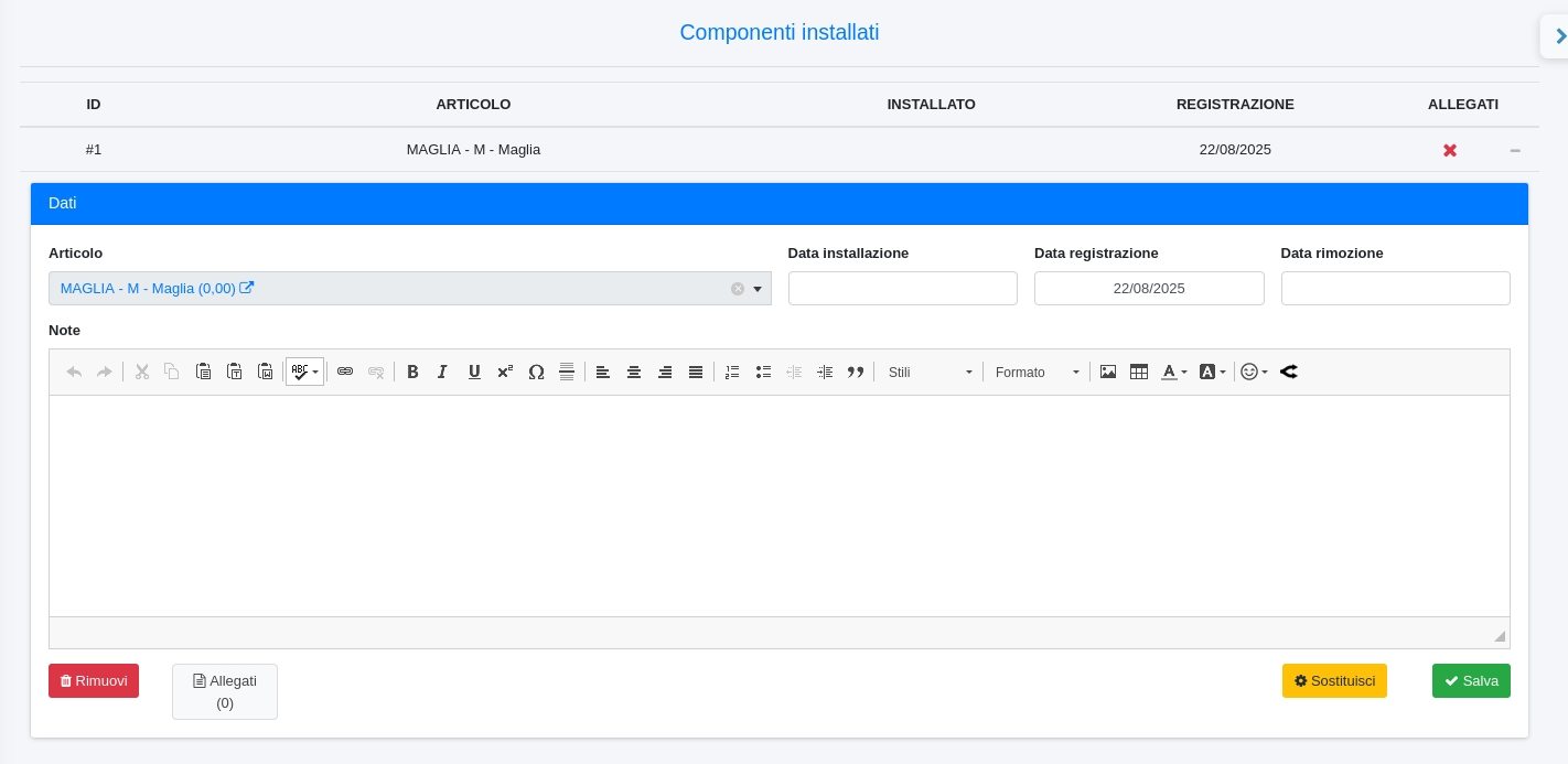 Il plugin Componenti permette di collegare degli articoli di magazzino all'impianto.