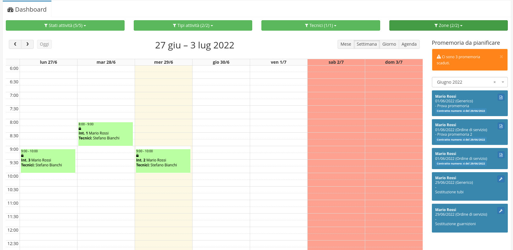 I promemoria creati verranno successivamente visualizzati nel modulo Dashboard per semplificare la pianificazione del giorno dell'intervento, ad esempio nel caso di interventi con cadenza mensile.