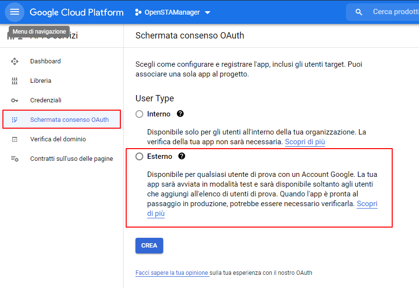 Il menu di navigazione laterale permette di accedere alla sezione per la configurazione della Schermata di consenso OAuth: qui è necessario selezionare User Type Esterno se non si ha accesso a Google Workspace.