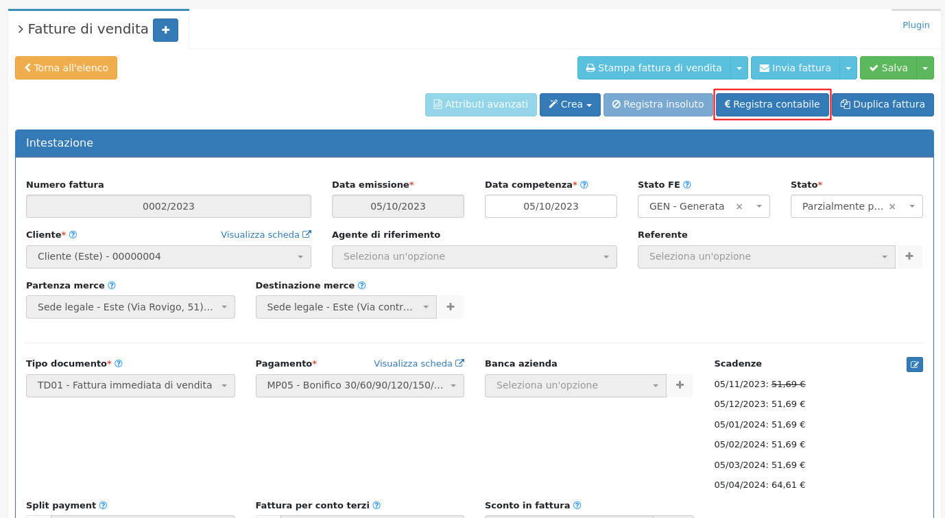 Per registrare il pagamento di una fattura è sufficiente aprire la fattura e cliccare sul tasto Registra contabile