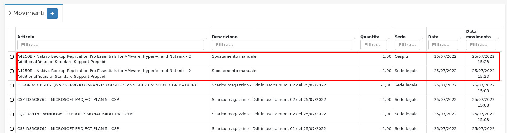 Tra i movimenti sarà ora possibile vedere il movimento appena effettuato, ovvero una diminuzione di 1 unità nella sede legale, e un aumento di 1 unità nella sede Cespiti.