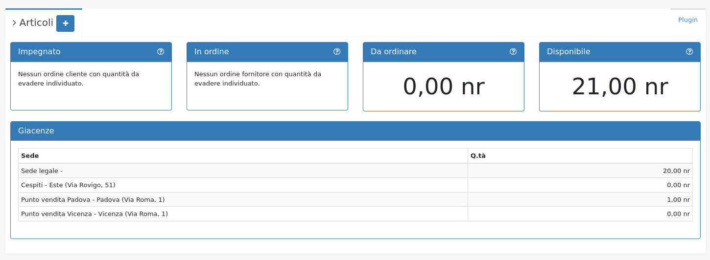 Per visualizzare le giacenze di un determinato articolo si deve andare in Magazzino/Articoli e selezionare l'articolo interessato. Da qui sarà possibile tramite il plugin Giacenze verificare la sua disponibilità e presenza nelle diverse sedi.