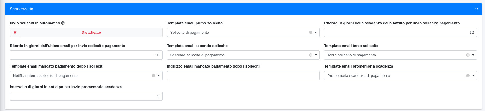 Dalle impostazioni dell'invio dei solleciti è possibile trovare le seguenti configurazioni: