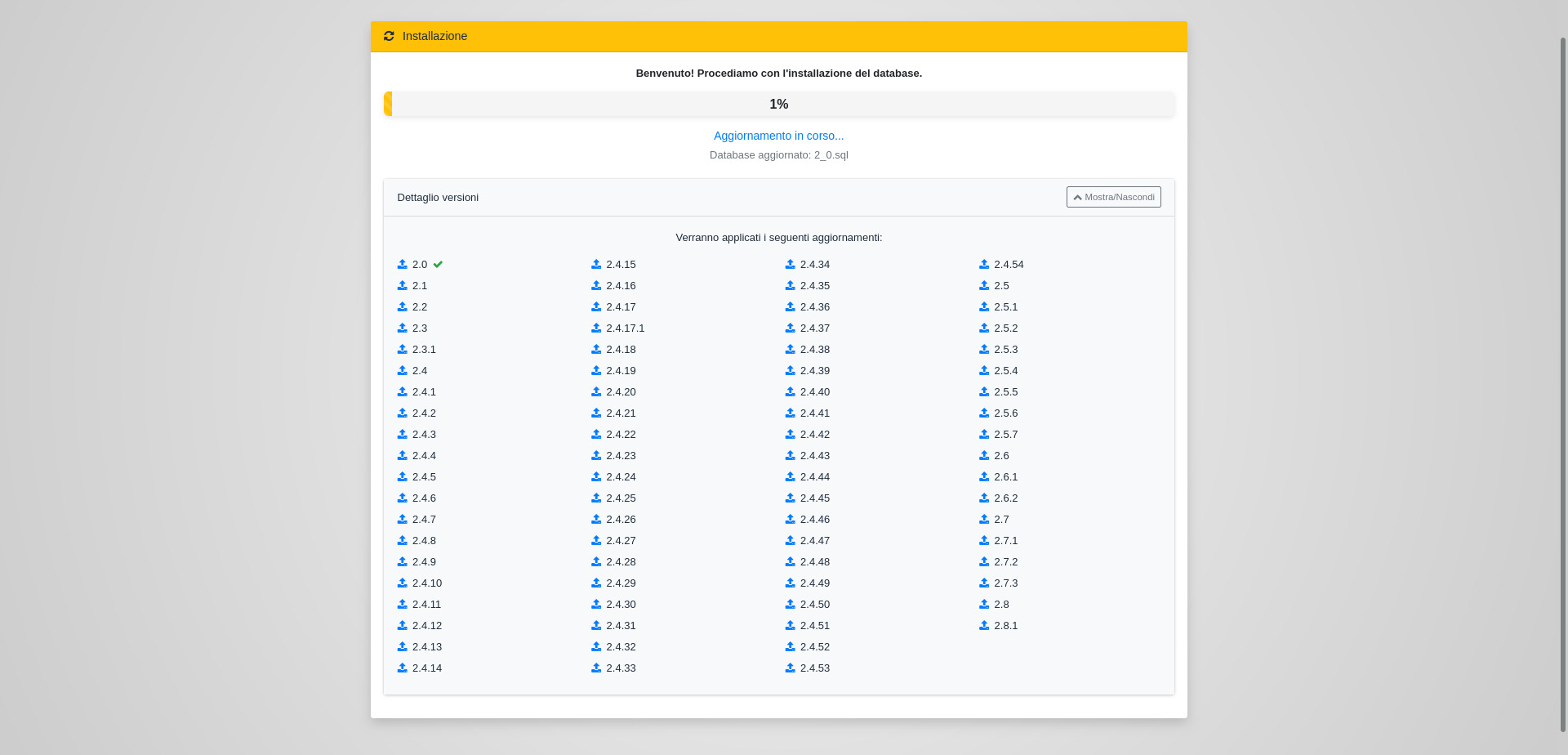 Se le credenziali inserite sono corrette, dopo aver cliccato su Installa si verrà reindirizzati alla procedura automatica di installazione del database.