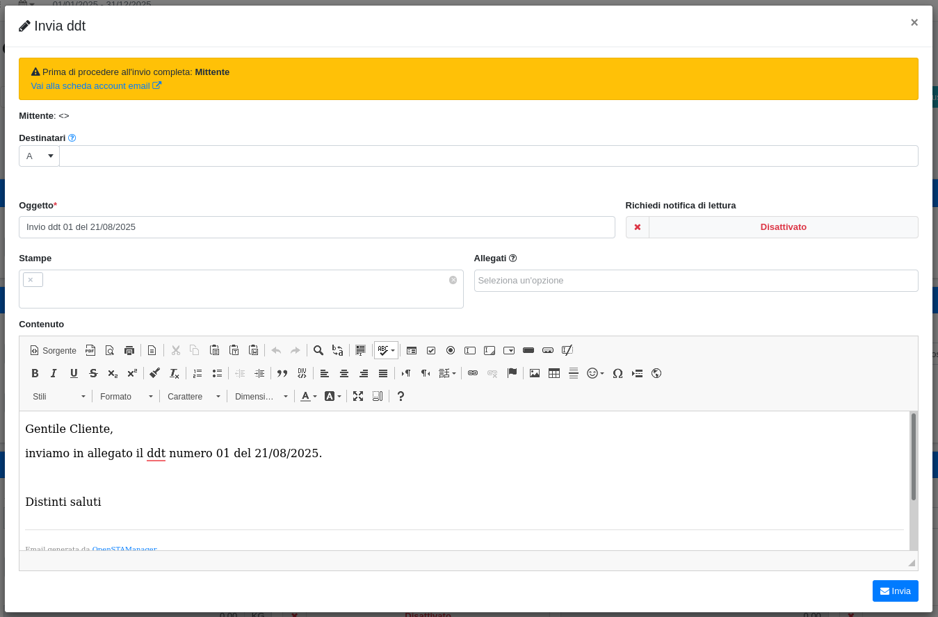 Si verrà quindi indirizzati al template email compilato con i dati del DDT, dove sarà possibile procedere all'invio cliccando su Invia.