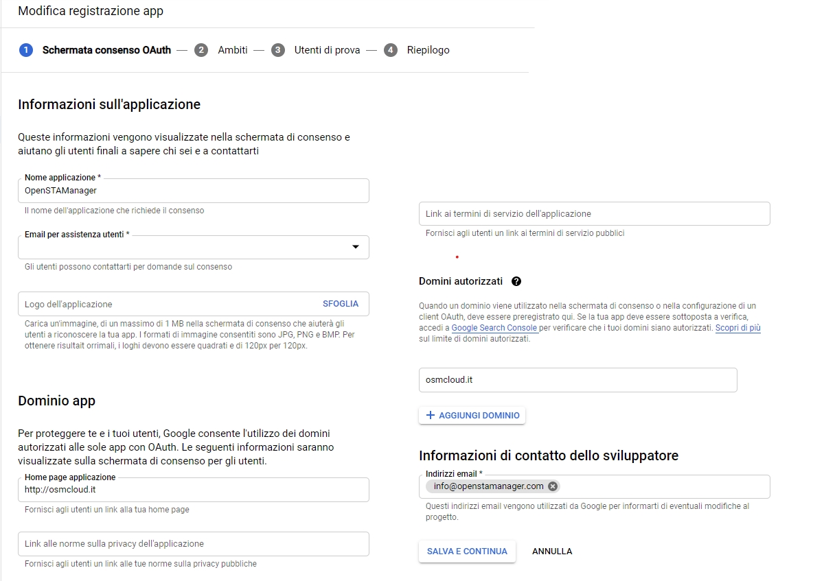 Una volta completata l'informazione di cui sopra, รจ necessario procedere alla registrazione di una applicazione dedicata per il servizio.