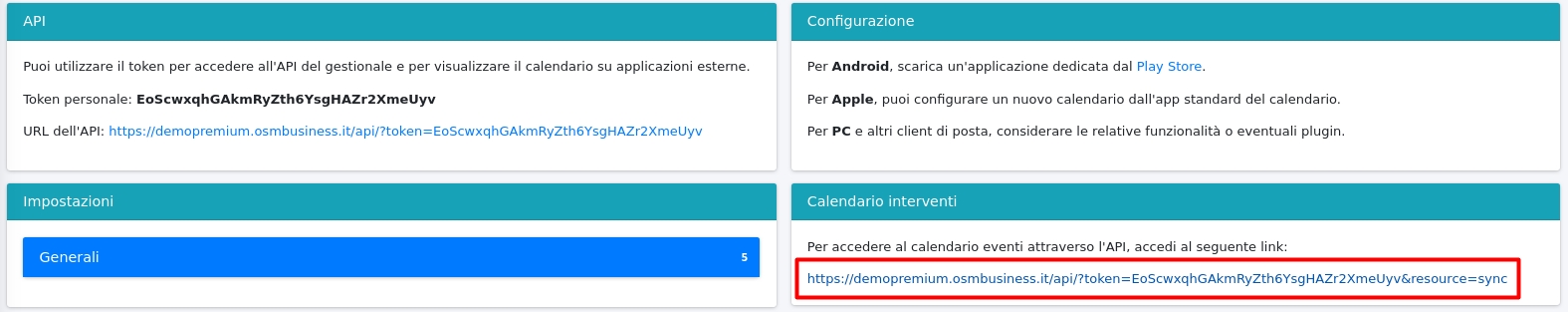 Per prima cosa, è necessario recuperare il token API, che è visibile nella schermata che si apre cliccando sul nome dell'azienda, sotto la sezione "calendario interventi".