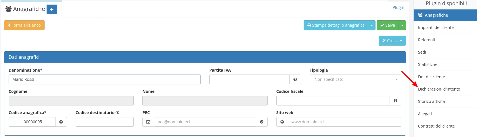 Per registrare una Dichiarazione d'intento si deve creare un'Anagrafica cliente o aprire quella del cliente interessato, e selezionare Dichiarazioni d'Intento tra i Plugin.