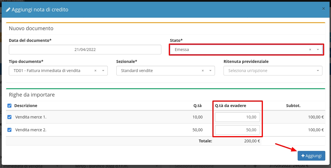 Da questa schermata sarà ora possibile modificare la quantità da evadere in caso di storno parziale, o annullare la fattura per il suo ammontare totale premendo il tasto Aggiungi.