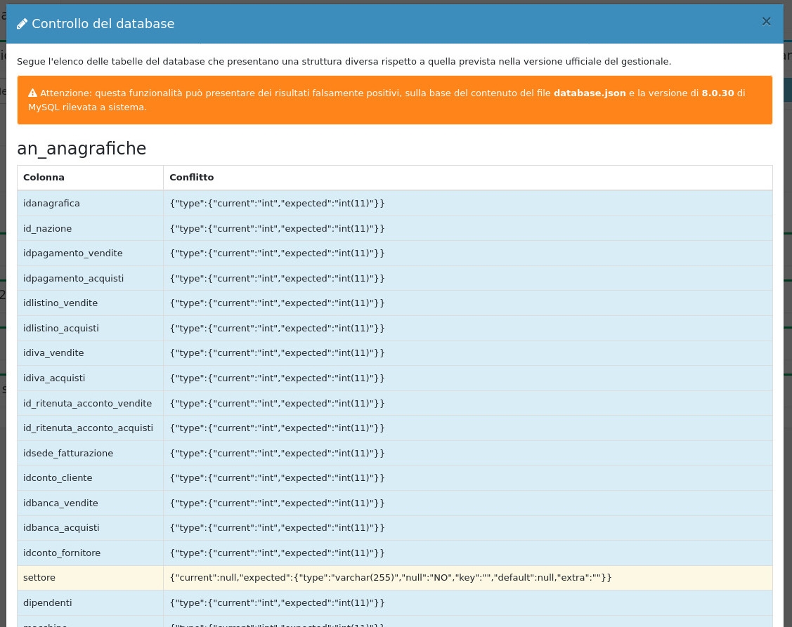 Questa funzionalitร puรฒ presentare dei risultati falsamente positivi, sulla base del contenuto del file database.json o nel caso di aggiornamento del database alla versione 8.0.30 di MySQL.
