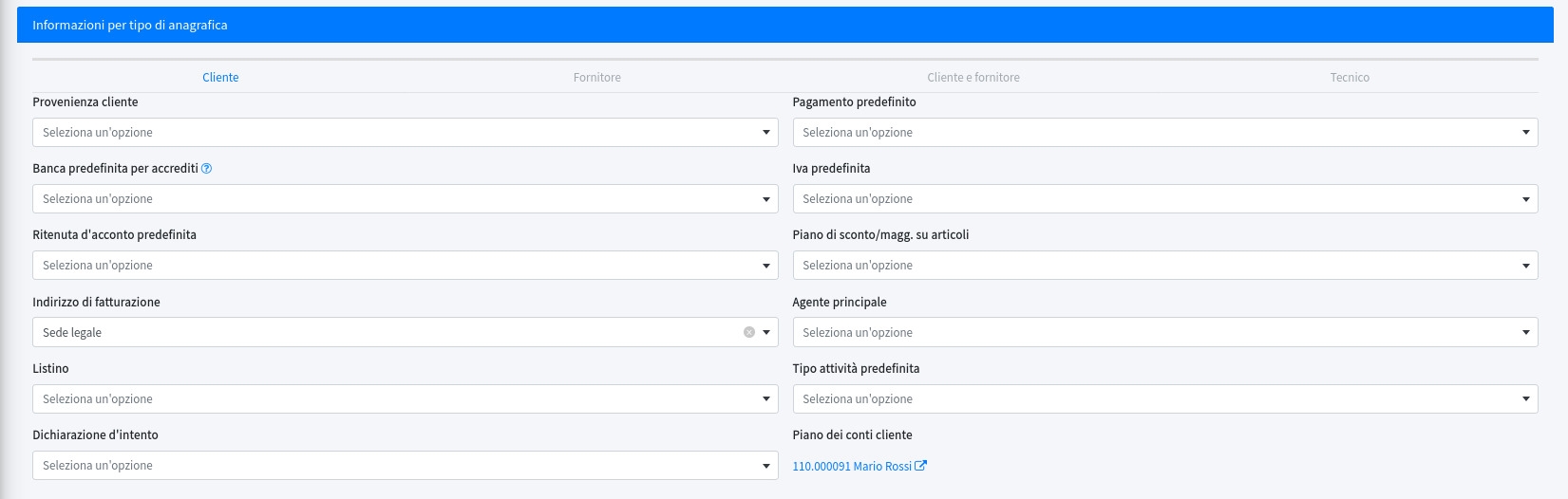 In questa sezione si possono impostare dei valori predefiniti in base al tipo di anagrafica:
