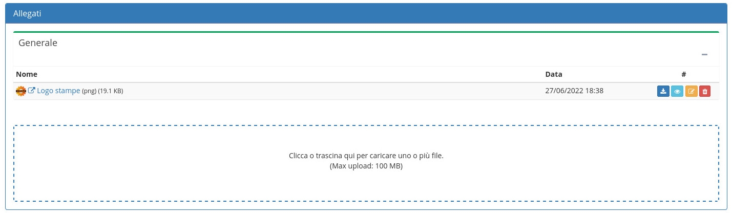 Attenzione: Selezionando l'anagrafica Azienda è possibile impostare il logo dell'azienda, caricando un file immagine con risoluzione 302 x 111 , e modificandone il campo Nome con "Logo stampe".