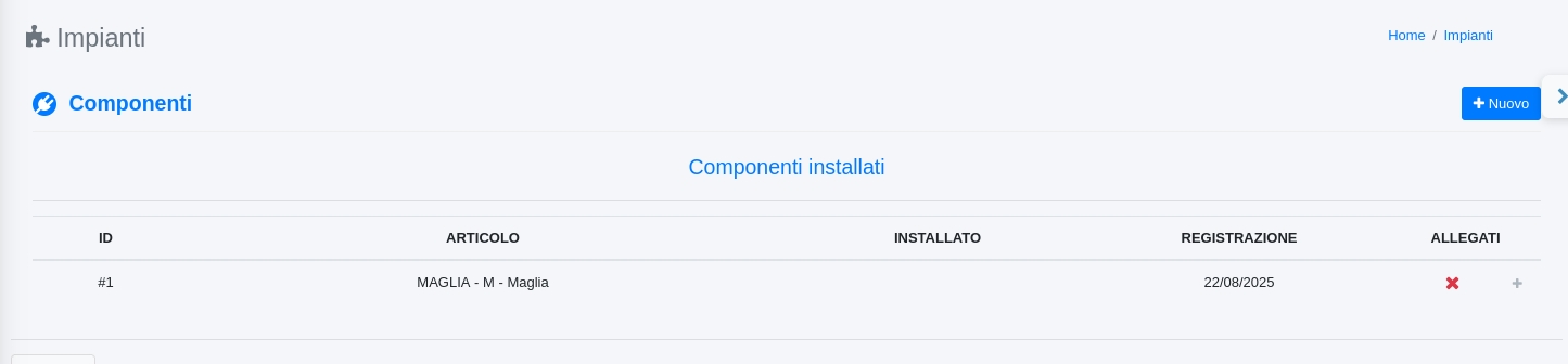 Data rimozione, fa riferimento alla data in cui il componente è stato rimosso dall'impianto