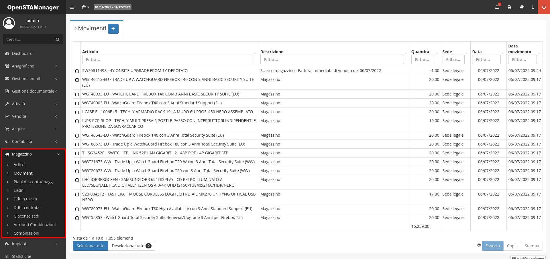 Ogni modulo della sezione Magazzino presenta plugin specifici legati alle sue funzionalità.