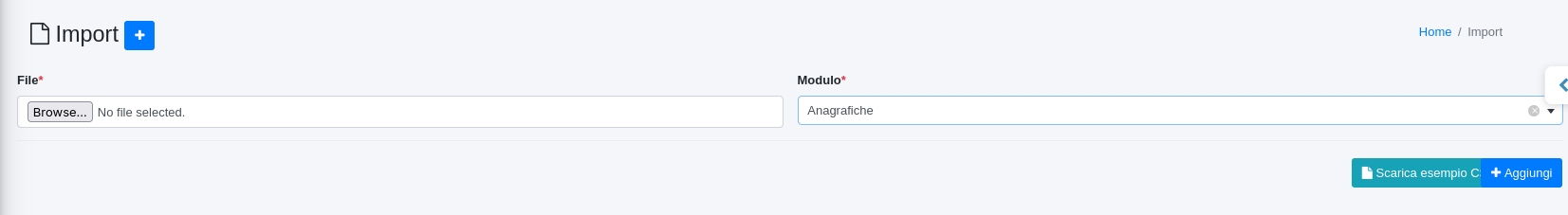 In Strumenti/Import è possibile scaricare un esempio di CSV impostando Anagrafiche nel campo modulo. Cliccando ora sul pulsante Scarica esempio CSV si aprirà un file di esempio di come importare le anagrafiche.