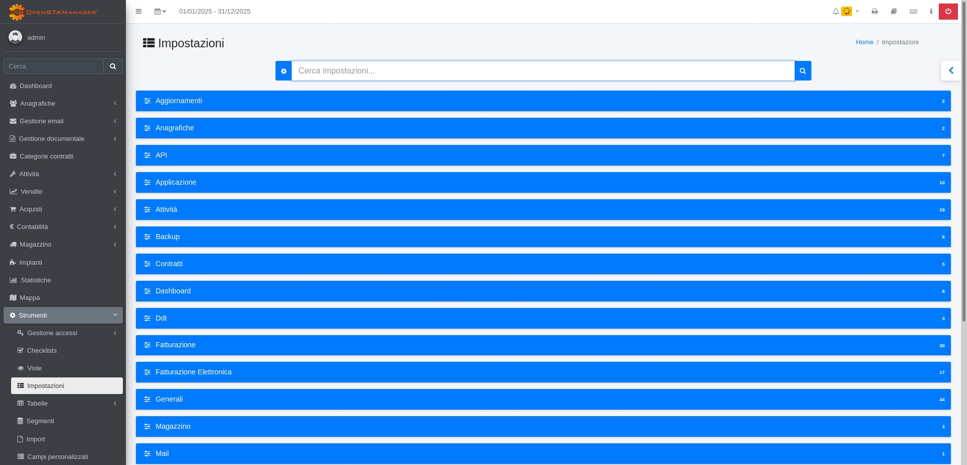 Il modulo impostazioni presenta tutte le impostazioni presenti a gestionale, suddivise per moduli: