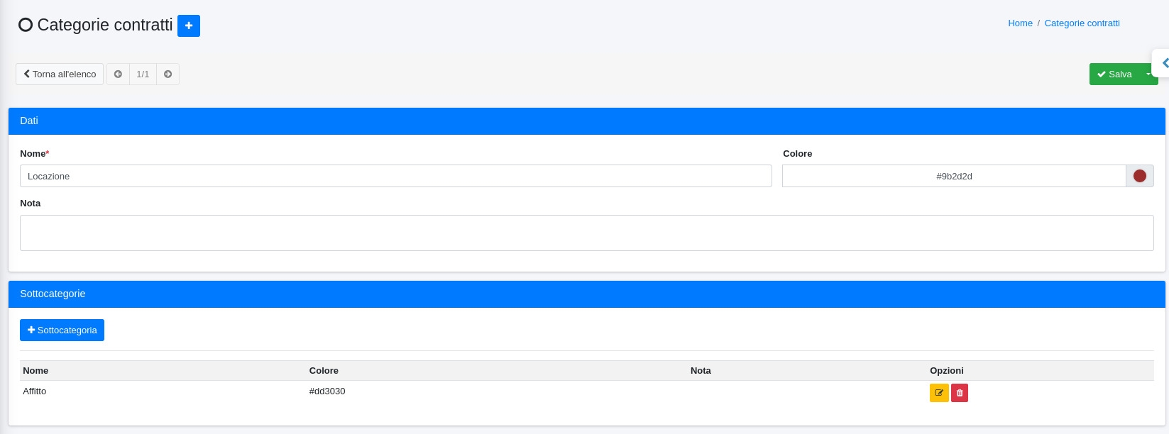Entrando nella categoria di contratti appena creato, sarà possibile creare delle sottocategorie cliccando su + Sottocategoria