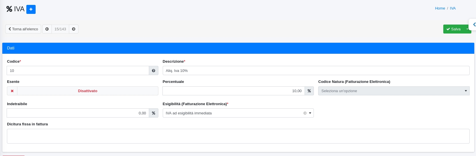 Per creare una nuova aliquota IVA si dovrà cliccare sul tasto (+).